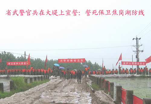 10时许,1200余名武警官兵和地方武装部队聚集焦岗湖农场(中心桥处)中心沟两岸,面对顽固的焦岗湖洪魔,向前来视察慰的中国人民解放军总政治部副主任刘振起中将宣誓: