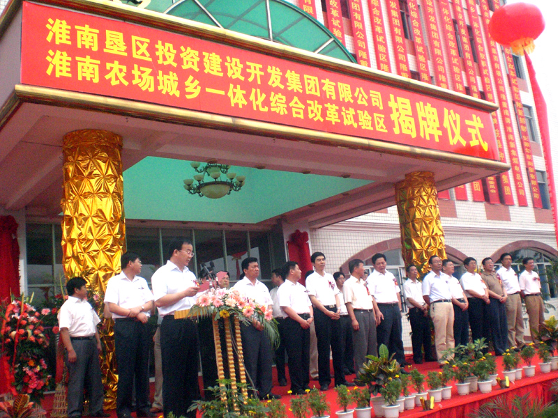 7月28日,淮南农场城乡一体化综合改革试验区、淮南垦区投资建设开发集团有限公司揭牌庆典在淮南农场场部举行。出席揭牌庆典的领导和嘉宾有:中共淮南市委书记、市人大主任杨振超,省农垦集团公司党委书记、董事长田文俊,淮南市政府市长曹勇,省农垦集团公司总经理李卓民,安徽省国资委第六监事会主席李永江,省农垦集团公司副总经理程军、李家堂,淮南市委常委潘祖华、何小祥、董庆、李忠、戴启远,市政协副主席方严、市政府副市长谌伟、市政府秘书长戴多斌,淮南市有关部门领导、省农垦集团公司机关各部门和农垦各下属企业领导以及淮南市企业界、新闻界领导等。揭牌庆典仪式由淮南市委常委、常务副市长戴启远主持。