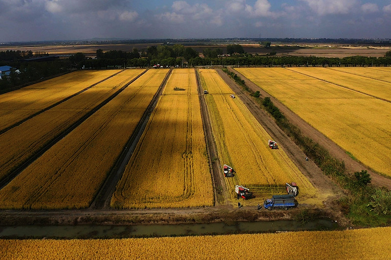 10月14日,潘村湖农场公司第二农业分公司统一经营田水稻开镰收割。