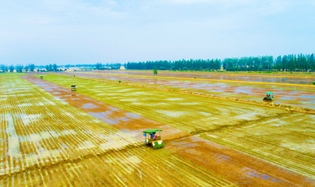 大圹圩农场水稻机插秧作业场景。