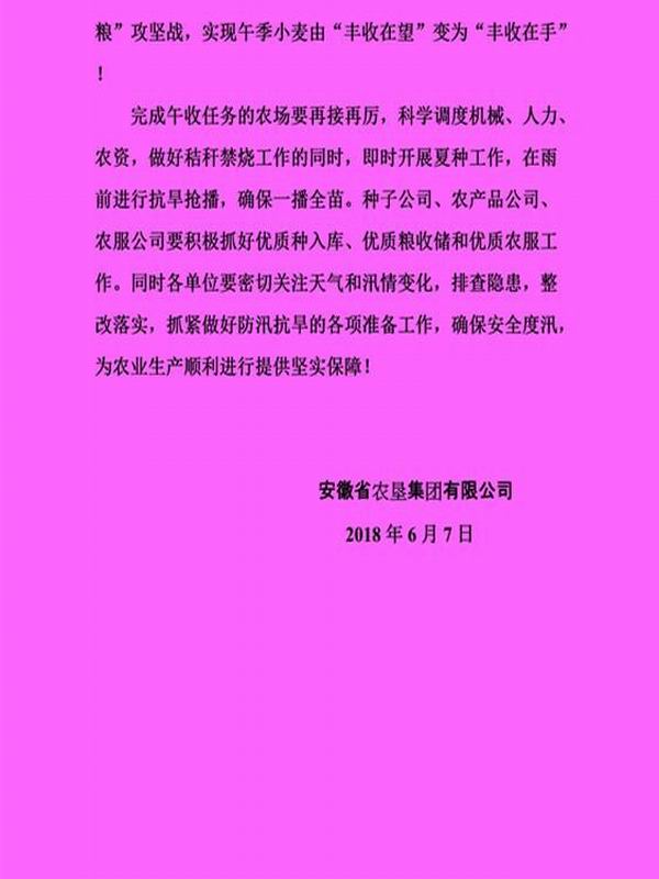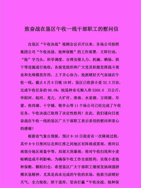 安徽农垦集团致信慰问午收一线干部职工