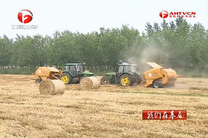 安徽台记者郑志:“我身旁的大型机械正在对地里的小麦秸秆进行打捆处理,打捆之后,大家可以看到,就是我身旁这个结结实实的大家伙,这为小麦秸秆下一步的综合利用创造了条件”。