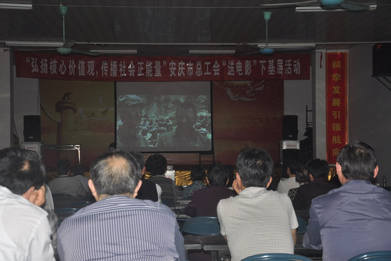 4月28日,安庆市总工会“送电影下基层活动”走进皖河农场,为农场职工群众放映了爱国主义影片《我的长征》,弘扬核心价值观,传播社会正能量,营造了庆祝“五一”、构建和谐的良好氛围,丰富了农场人的精神文化生活。(徐丽燕)