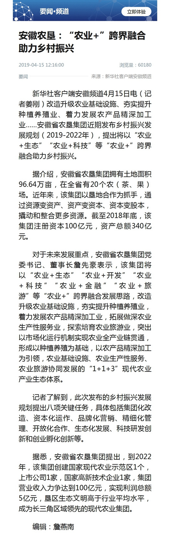 4月15日新华社客户端要闻频道报道《安徽农垦:“农业+”跨界融合助力乡村振兴》,报道截图如下: