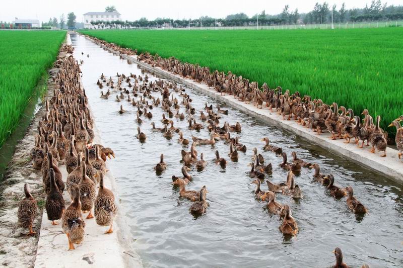 日前,安徽农垦龙亢农场有机农业开心稻田里,3000只麻鸭游进稻田。今年的200亩开心稻田,以每亩15只标准放养稻田麻鸭,利用鸭子除草除虫的办法,提升稻田的生态安全质量。(农民日报2017年8月8日08版,李峰摄)