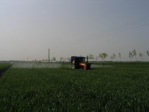 潘村湖农场今年3.2万亩优质小麦长势喜人,丰收 在望.进入4月下旬以来,该场根据小麦生长习性,结 合植保部门提供的信息,制定了旨在增加穗数,提高 穗重,防治病虫害的小麦生长后期田间管理方案.图 为4月24日下午,家庭农场职工正按照总场统一部署 在规定时间内在大田实施药剂喷施作业的情景.(杨 登宏摄)
